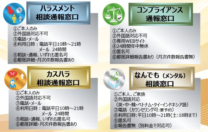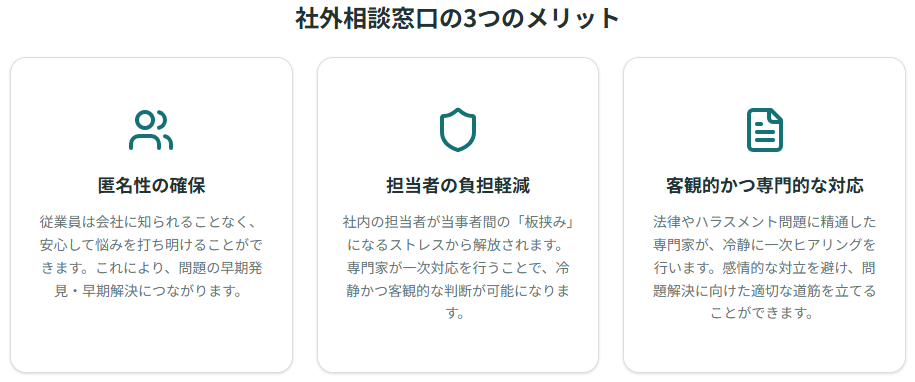 相談体制の整備は、対策の要です。しかし、「相談してもどうせ解決しない」「相談したことがバレて不利益を被るかもしれない」といった従業員の不安は、社内窓口だけでは払拭が難しいのが実情です。そこで有効なのが、外部の専門家が運営する「社外相談窓口」です。